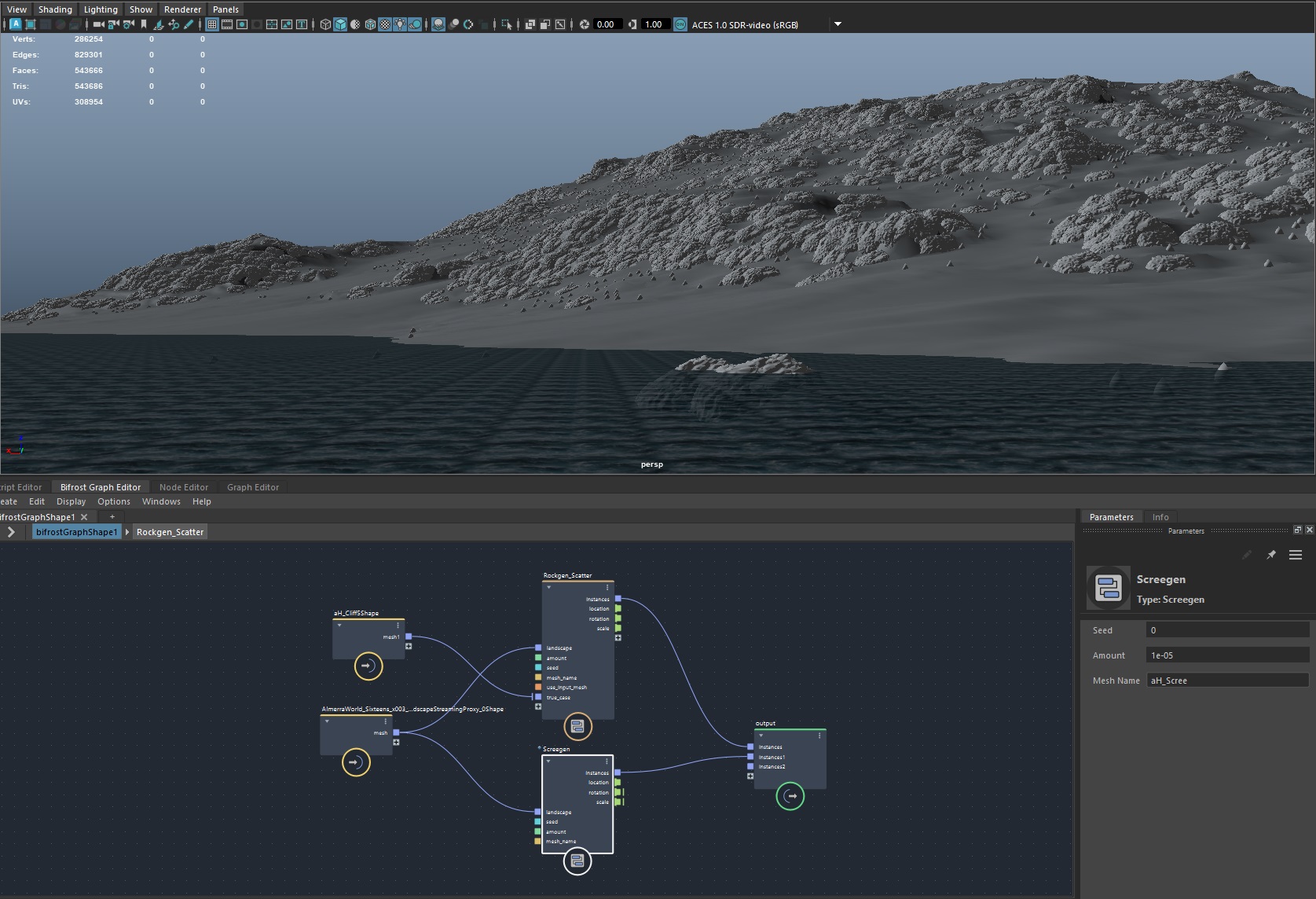 So I’ve been experimenting a lot with Bifrost in Maya lately and came up with some interesting things I’d like to share concerning scattering foliage. Typically I think most game companies do this sort of thing in Houdini, but since that’s a separate package with extra licensing, etc and may/may not be within a budget there’s another option. Bifrost is a Maya plugin that comes free within the DCC that is a node-based effects creator. It does Fluids and particles, as well as cloth and crowd stuff but what I’ve been experimenting with lately is using it for instanced foliage scattering.