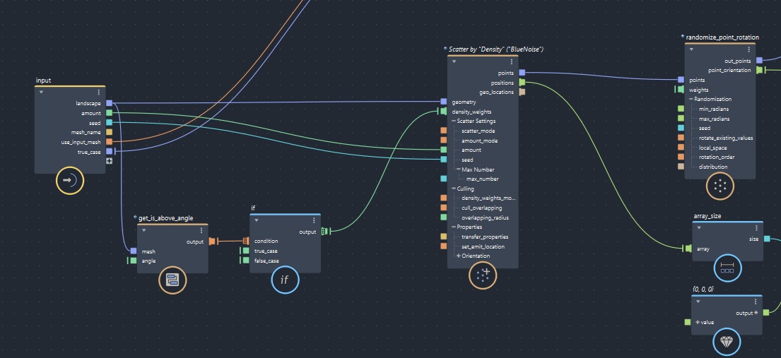 With the scattering part setup, you can then collapse the whole setup into its own compound (similar to a Blueprint function). I included a ‘mesh’ input to allow for plugging in geometry (static meshes in my case) within Maya to populate the scattered points instead of basic shapes for a nicer preview. With the compound, you can make as many copies of it as you have mesh variations. So for a tall tree mesh you can have different settings than a shorter tree mesh, and so on.