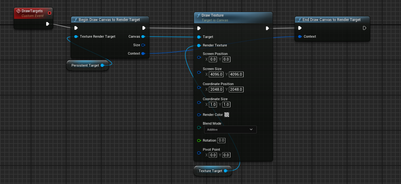 Now this drawing needs to be done on Tick in order for the painting to be continuous, so the above DrawTargets function can be added to the same actor containing the SceneCaptureComponent2D so it can easily reference the target RT. It can also be triggered from within SequenceDirector and reset/cleared via event triggers.